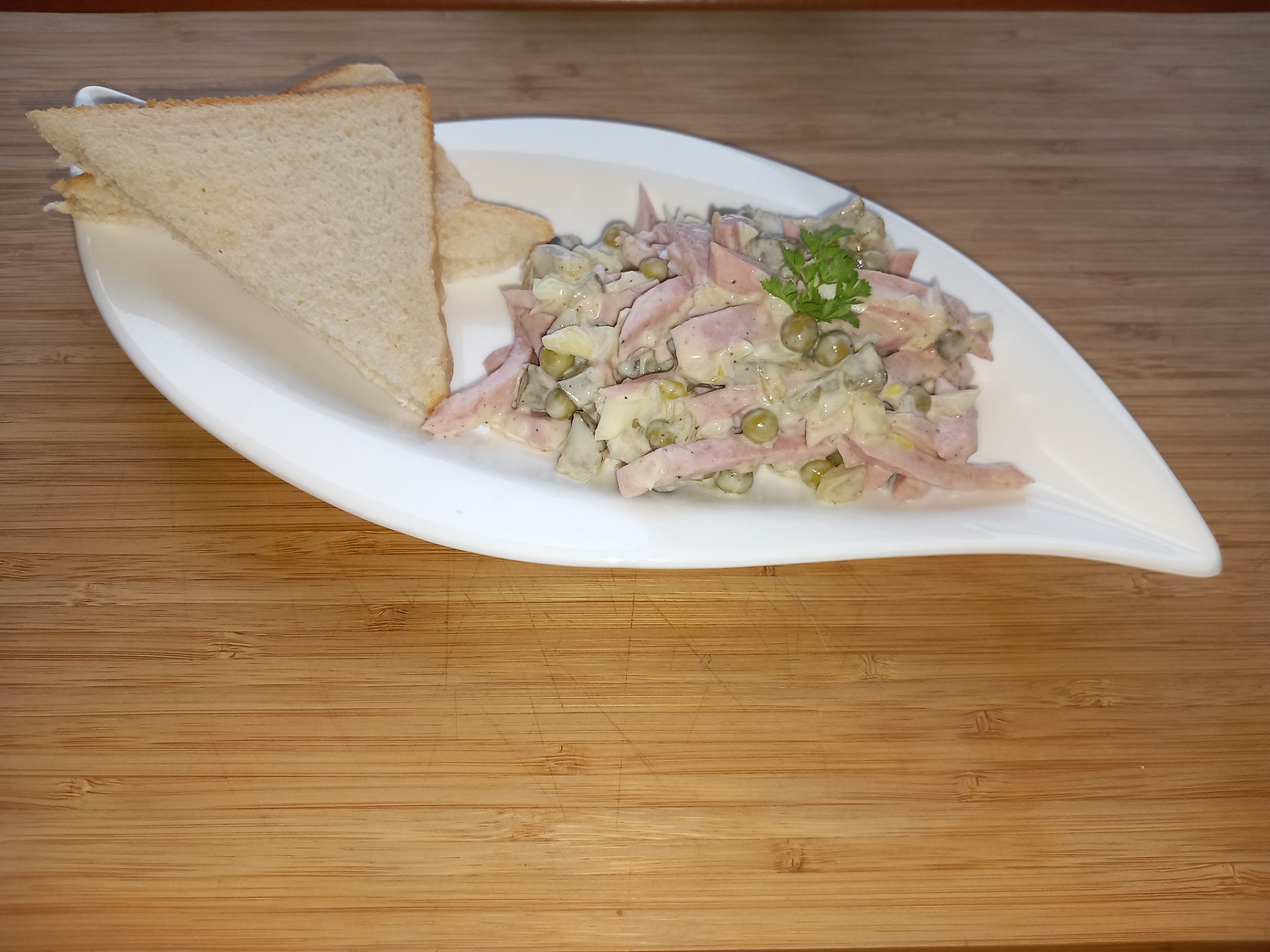 Měkký salám (nebo můžete použít i šunku, šunkový podle chuti) nakrájím na nudličky, přidám naloženou okurku, hrášek (z plechovky), cibuli, cukr podle chuti, worčestr, hořčici, sůl, pepř, majonézu, podle chuti můžete dát i ocet.